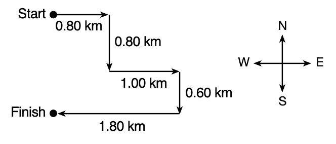 Solution: Displacement is a vector that connects the starting point to the end point. In this case, the end point is exactly 1.4km south of the starting point. Choice (2)