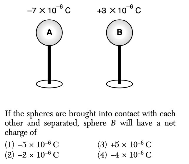 Solution: Once the spheres come into contact with, the charges will evenly distribute between the two spheres. Choice (2)
