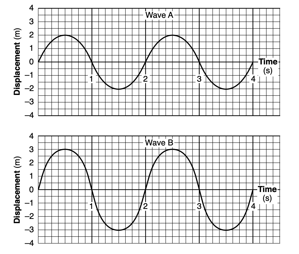 34 The graphs below show the displacement of a certain particle in a medium versus time due to two periodic waves, A and B, traveling through the medium.
