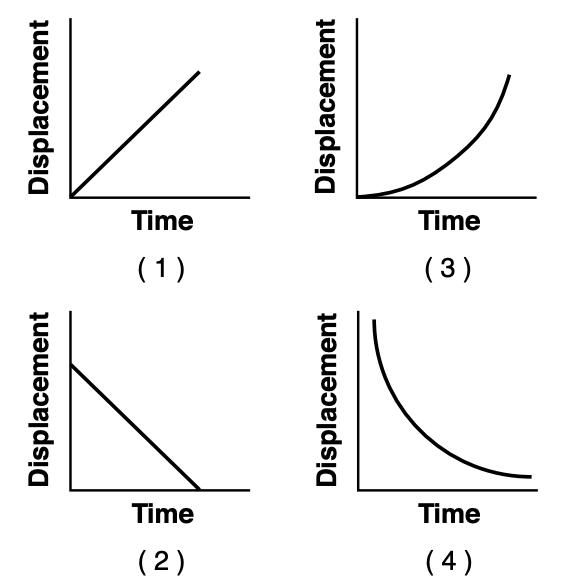 Solution: A constant positive velocity will have a graph of displacement vs time graph that is linearly increasing. Choice (1)