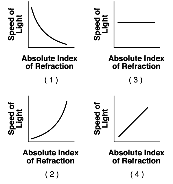 39 Which graph best represents the relationship between the speed of light (f = 5.09 * 1014 Hz) in a transparent medium and the absolute index of refraction of the medium?