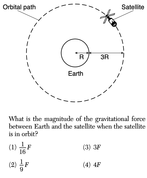 42 A gravitational force of magnitude F exists between Earth and a satellite on Earth’s surface. The satellite is sent into orbit at a distance of three Earth radii above Earth’s surface, as shown in the diagram below.