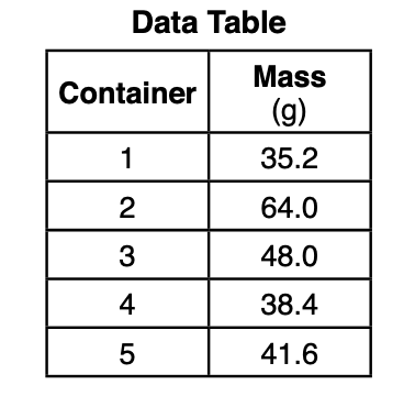 43 As part of an investigation on quantization, a student measured and recorded the mass of fi ve identical containers, each holding a different number of pennies. The table shows the student’s data.