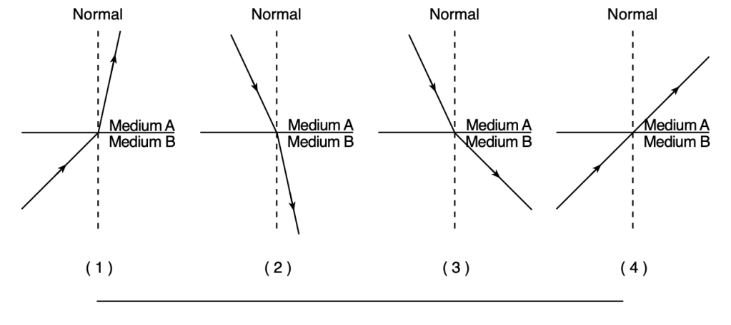 Solution: If the speed of light increased after going into the 2nd medium, that must mean that the index of refraction is smaller. Based on Snell’s law, it must mean that the angle of refraction is bigger than the angle of incidence. Choice (3)