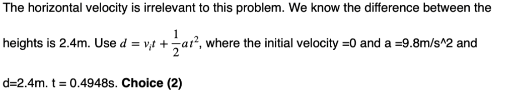 Solution: Use the formula Vf2=vi2+2ad , we can solve for distance by plugging in initial and final velocities (15m/s and 21m/s, respectively) and the acceleration (3m/s^2). d = 36m. Choice (3)